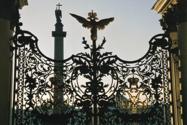Two-Headed Eagle atop one of The State Hermitage Museum - Winter Palace's gates looking towards the Alexander Column in Palace Square.