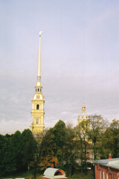 The Peter and Paul Cathedral Spire as seen from the wall of the Peter and Paul Fortress.