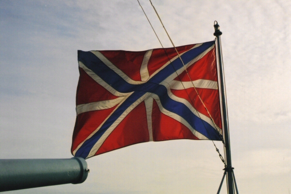 Russian Navy jack on the bow of the Cruiser Aurora.