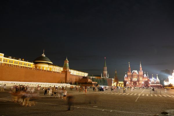 Lenin's Mausoleum (centre) at night as seen from Lobnoye Mesto